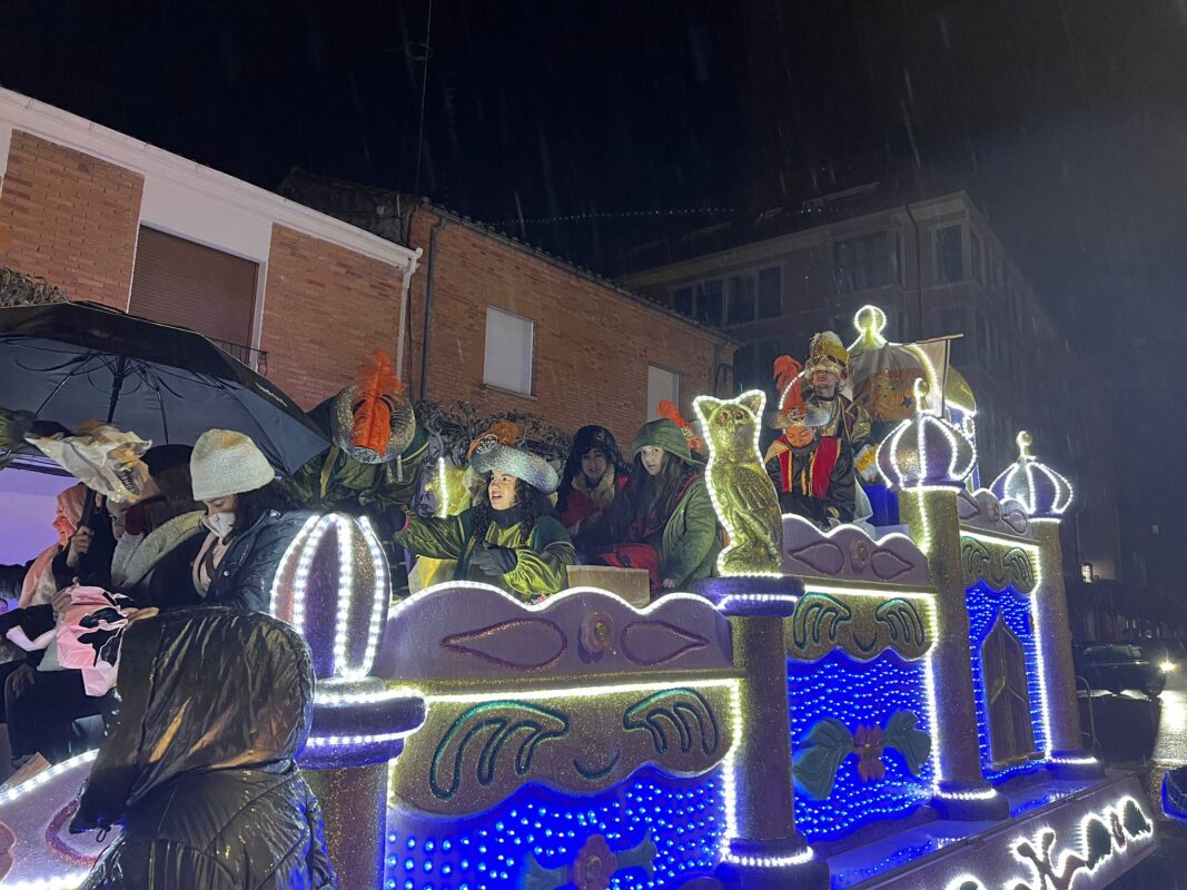 A las siete en punto, la lluvia comenzó a caer con fuerza, pero los Reyes Magos no se hicieron esperar. Desde sus carrozas, saludaban a los niños, que, bajo paraguas y abrigos, se asomaban para recibir los caramelos lanzados por sus majestades.