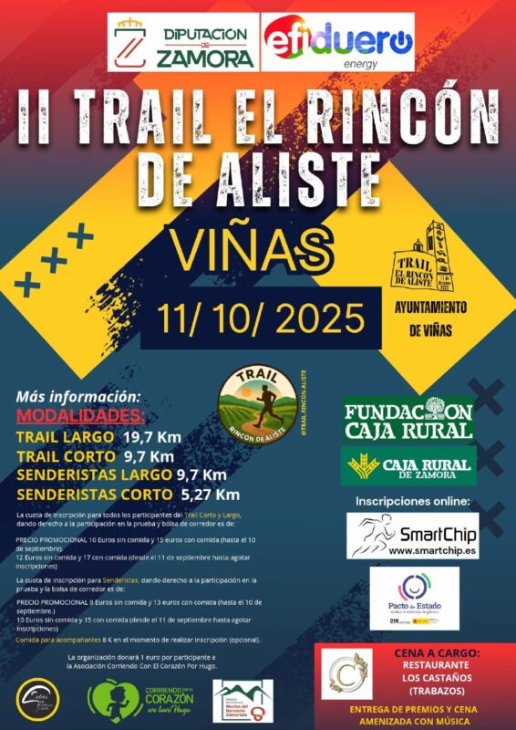 El Ayuntamiento de Viñas de Aliste ha anunciado la apertura del plazo de inscripciones para la segunda edición del Trail “Rincón de Aliste”, que se celebrará el próximo 11 de octubre en esta localidad zamorana. La prueba promete ser un punto de encuentro para corredores, senderistas y amantes del turismo rural.