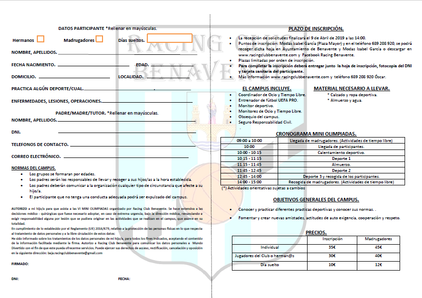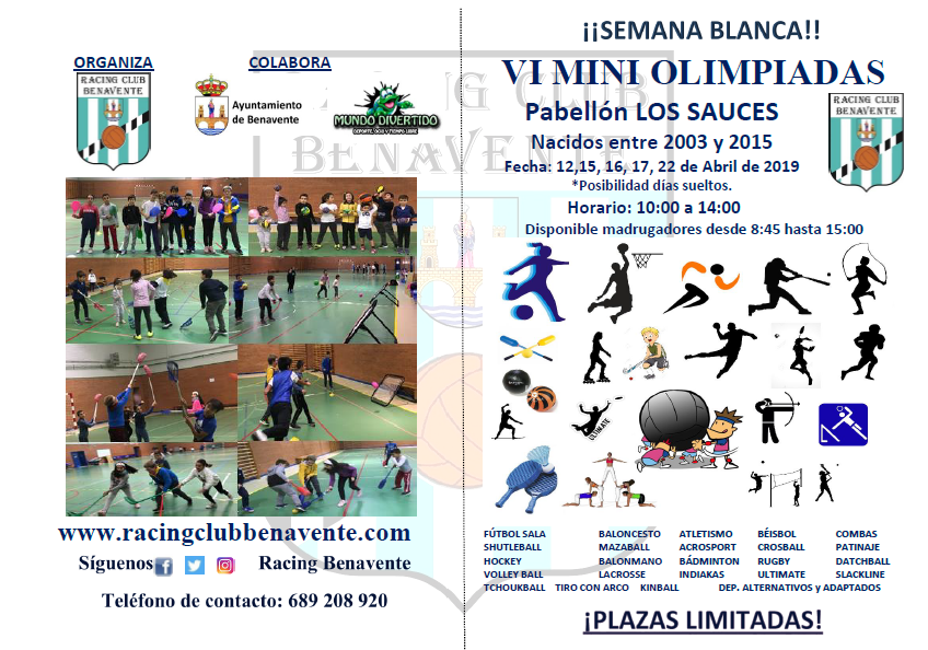 Mundo Divertido y el Racing Club Benavente vuelven a activar las Mini Olimpiadas que cumplen su sexta edición con el fin de que la Semana Santa no se haga larga sin la práctica de deporte por parte de los pequeños. Las inscripciones se prologarán hasta este martes 9 de abril.