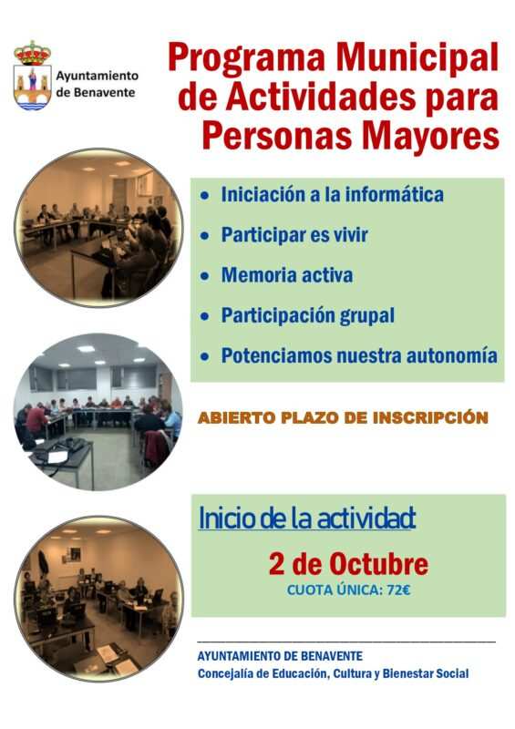El Ayuntamiento de Benavente informa desde su Concejalía de Educación, Cultura y Bienestar Social que ya se encuentra el plazo abierto para inscribirse en las diferentes actividades del Programa Municipal de Mayores 2023 que arrancará el próximo 2 de octubre y que tendrá un coste de 72 euros.