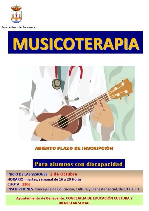 El Ayuntamiento de Benavente informa desde su Concejalía de Bienestar Social que ya se encuentra abierto el plazo de inscripción para la actividad de ‘Musicoterapia’ dirigida para alumnos con discapacidad.
