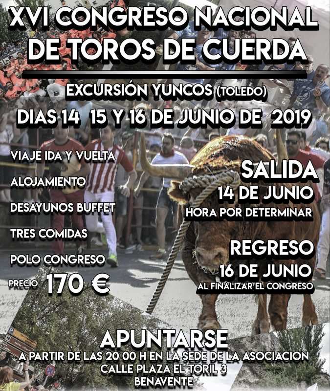 La Asociación Benaventana del Toro Enmaromado, con motivo del próximo Congreso Nacional del Toro de Cuerda que se celebrara los días 14, 15 y 16 de Junio de 2019, en la localidad de Yuncos (Toledo), tiene programado un viaje para todos los que deseen acudir con su colectivo para asistir a las distintas actividades como por ejemplo pueden ser las exhibiciones de las localidades, charlas, degustaciones gastronomicas durante todo el fin de semana.