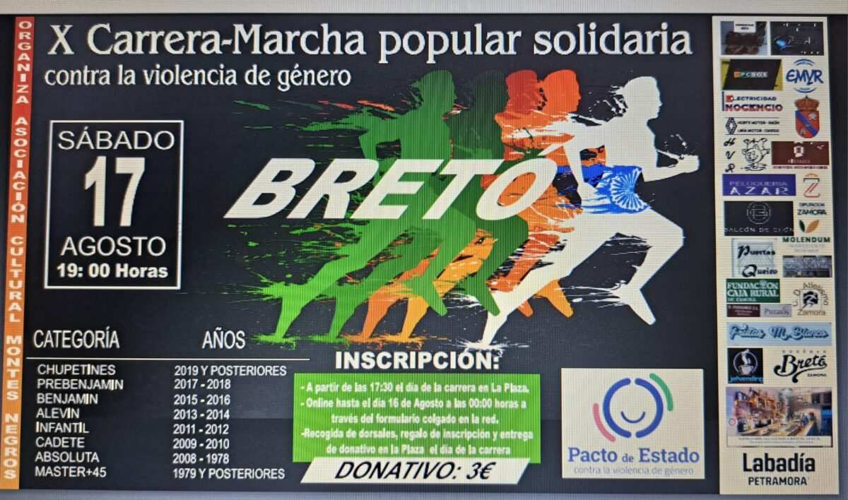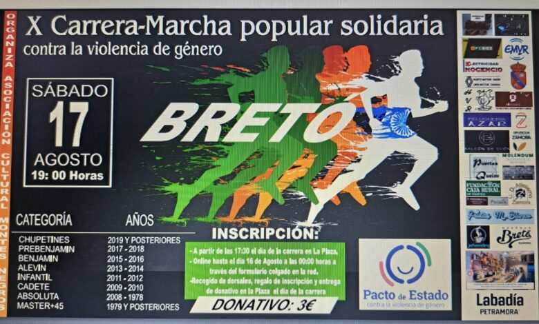 El sábado 17 de agosto, a las 19:00 horas, Bretó acogerá su X Carrera-Marcha Popular Solidaria. Este evento busca recaudar fondos para combatir la violencia de género. La inscripción está abierta para diversas categorías, desde chupetines (nacidos en 2019 y posteriores) hasta la categoría Master+45 (nacidos en 1979 y posteriores).