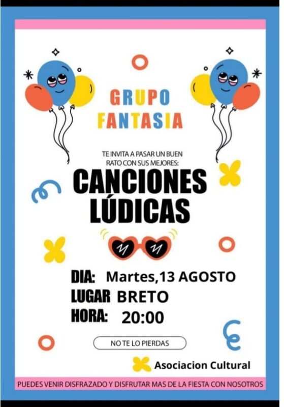 El martes 13 de agosto, a las 20:00 horas, el Grupo Fantasía se presentará en Bretó con un espectáculo lleno de canciones lúdicas. ¡Anímate a asistir disfrazado y disfruta aún más de la fiesta! La Asociación Cultural invita a todos a pasar un rato agradable con ellos.