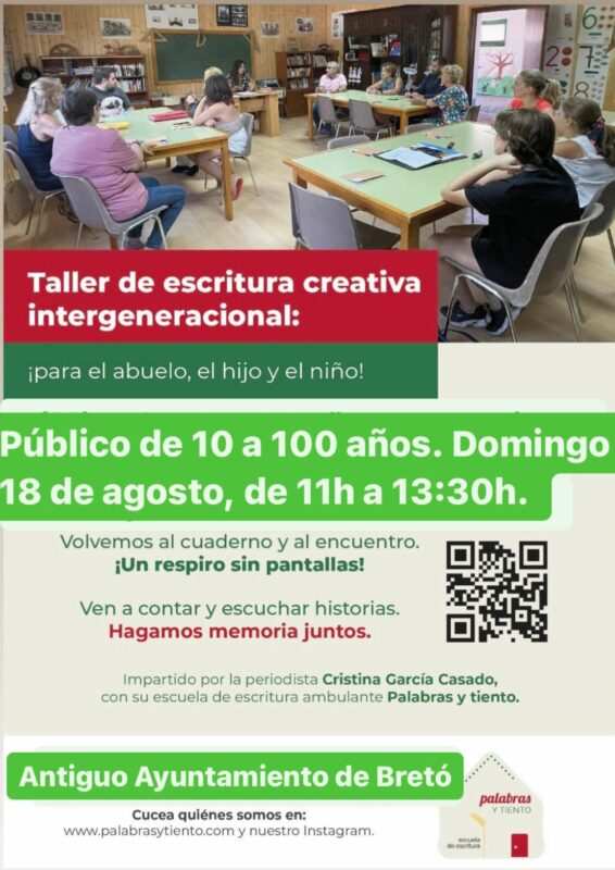 Para los amantes de las palabras, el domingo 18 de agosto, de 11:00 a 13:30 horas, se llevará a cabo un taller de escritura creativa en el Antiguo Ayuntamiento de Bretó. Este taller está dirigido a un público de 10 a 100 años, ofreciendo un respiro sin pantallas para contar y escuchar historias. Será impartido por la periodista Cristina García Casado, de la escuela de escritura ambulante Palabras y Tiento.