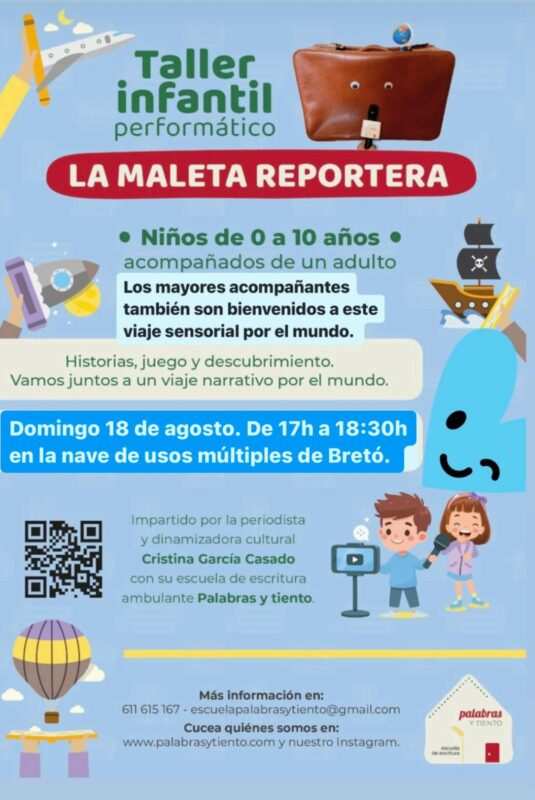 El domingo 18 de agosto, de 17:00 a 18:30 horas, en la nave de usos múltiples de Bretó, se llevará a cabo el Taller Infantil Performático: La Maleta Reportera. Este taller está diseñado para niños de 0 a 10 años, quienes deberán estar acompañados por un adulto. Los mayores también son bienvenidos a disfrutar de un viaje sensorial lleno de historias, juegos y descubrimientos. Impartido por la periodista y dinamizadora cultural Cristina García Casado con su escuela de escritura ambulante Palabras y Tiento.