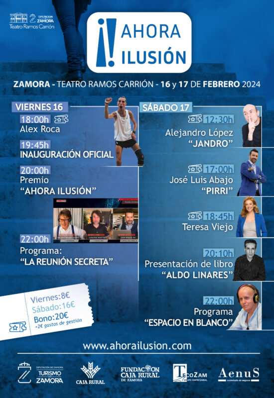 En el escenario del Teatro Ramos Carrión también intervendrán dentro del marco de Ahora Ilusión Alejandro Gómez, “Jandro”, que lleva años transformando la ilusión en humor y magia en sus diferentes proyectos televisivos -entre los que destaca sus años en El Hormiguero-, cinematográficos y teatrales; el deportista José Luis Abajo “Pirri” que, tras llegar a lo más alto en el mundo de la esgrima comparte a través de sus conferencias todos los valores que este deporte le ha aportado, y la periodista Teresa Viejo, que llevará a cabo una charla en la que hablará de la curiosidad vinculada a la emoción. Como ya viene siendo tradición, también se entregará el Premio Ahora Ilusión en un acto muy emotivo que consiste en la imposición de una manta zamorana y cuyo ganador se dará a conocer una semana antes de la celebración del encuentro.