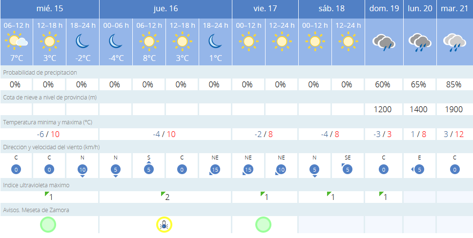 Este jueves 16 de enero, Benavente estará en alerta amarilla por bajas temperaturas, con mínimas que podrían alcanzar los -6°C, especialmente durante la madrugada. A lo largo del día, se espera cielo despejado y temperaturas máximas de 8°C. El riesgo de heladas será alto, especialmente por la mañana y la noche.