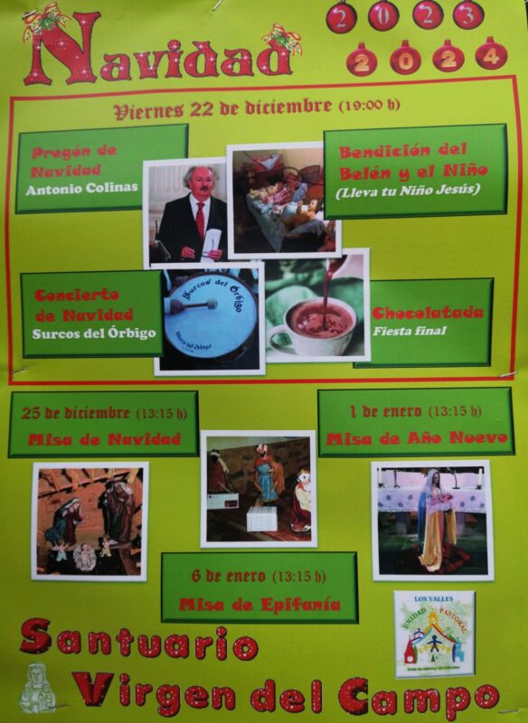Antonio Colinas abrirá el programa navideño en el templo mariano a las siete de la tarde del viernes 22 de diciembre. Posteriormente se realiza la bendición del Belén y de las figuras del Niño Jesús traídas expresamente desde las localidades vidrialesas. El concierto de Navidad a cargo del grupo Surcos del Órbigo y la degustación de una chocolatada abren la primera tabla del abanico de actos en el santuario del Valle de Vidriales.