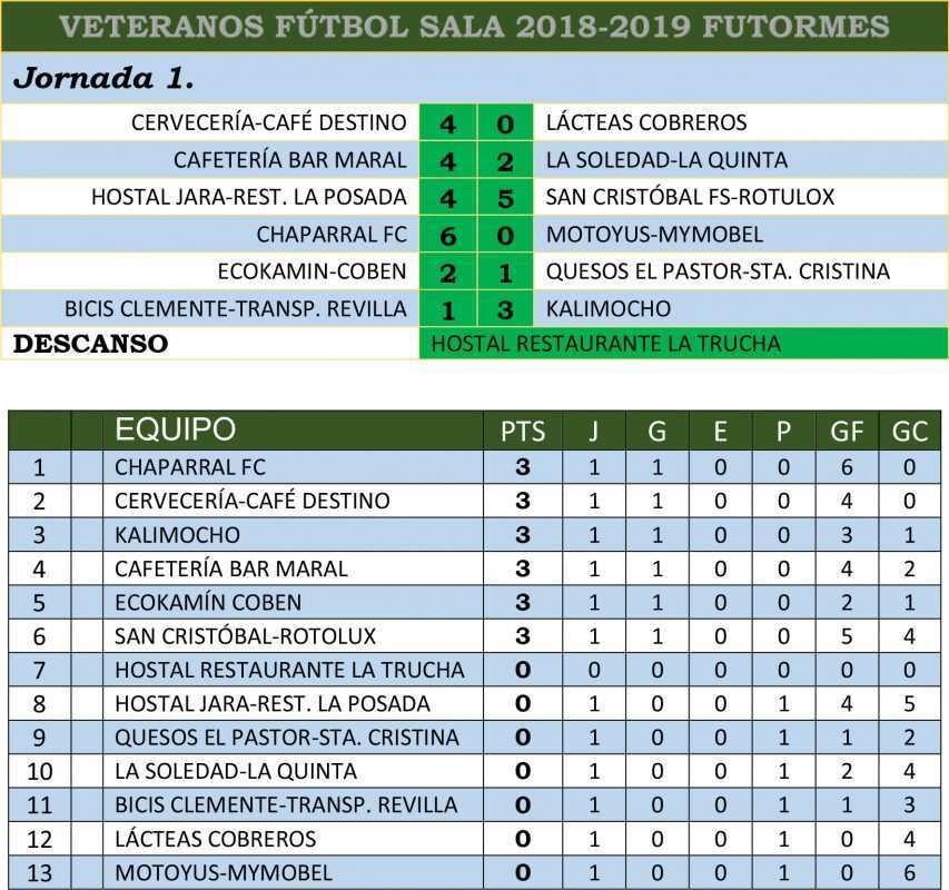 La primera jornada marca la senda de un Chaparral que asesta una goleada al Motoyus-Mymobel dejando claro que va a ser muy caro el relevarle. También el Destino vencía con comodidad en el suyo deshaciéndose del debutante Lácteas Cobreros. El resto de los partidos fueron más disputados con los marcadores más apretados aunque Kalimocho logró imponerse por dos tantos de diferencia al Bicis Clemente-Transportes Revilla al igual que el Café Bar Maral a la Soledad-La Quinta. Coben Cerámicas-Chimeneas Ecokamín y San Cristóbal-Rotolux lo tuvieron más justo con victorias por la mínima a Quesos el Pastor Santa Cristina o .