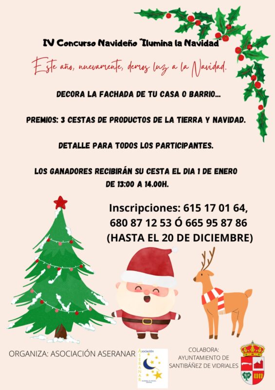 Bajo el lema «Ilumina la Navidad» la asociación cultural recomienda al vecindario ornamentar las casas, ventanas y balcones con motivos navideños luminosos y con el tradicional Belén. Desde este colectivo cultural se recomienda realizar las inscripciones antes del próximo 20 de diciembre, a la vez que informa de que todos los participantes serán obsequiados con un detalle y los tres ganadores del concurso recibirán una cesta con productos de la tierra.