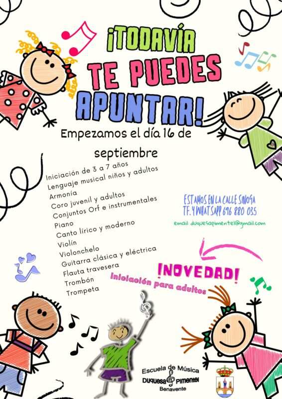 La Escuela de Música Duquesa Pimentel de Benavente está a punto de comenzar su nuevo curso académico el próximo 16 de septiembre, y aún tienes la oportunidad de inscribirte en alguno de los cursos ofrecidos.