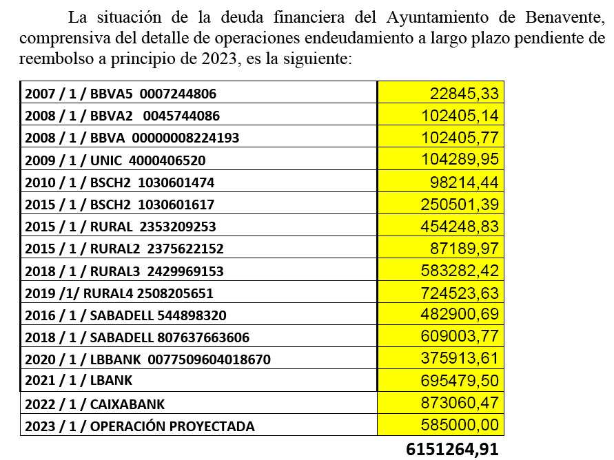 Y ¿cuál es la deuda actual del Ayuntamiento?, se pregunta el PP cuya portavoz municipal lo aclara en base a los informes del Tesorero, refiriendo que en 2023, una vez se materialice el préstamo que va a solicitar el equipo de gobierno para inversiones, la deuda será de más de seis millones de euros (6.151.264 euros). Una deuda que se terminará de pagar dentro de 10 años, en el año 2033.