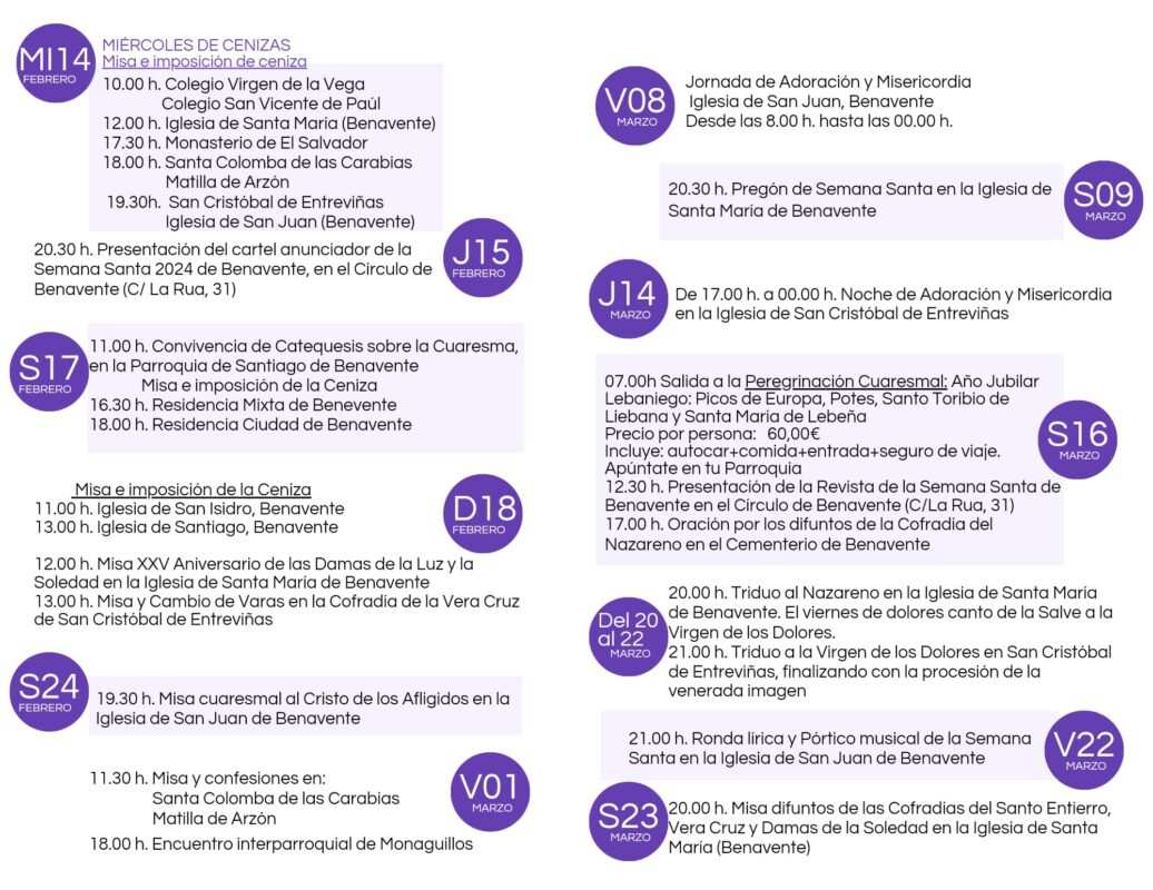 Para el sábado 17 de febrero, a las 11:00 horas, está prevista la imposición de la ceniza en la iglesia de Santiago y por la tarde en la residencia mixta Los Valles y en la Ciudad de Benavente. Las iglesias de San Isidro y de Santiago celebran el ritual el domingo 18 por la mañana.