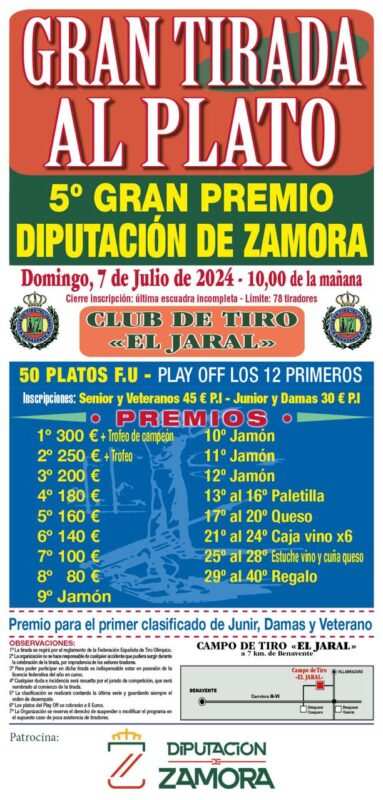 El Gran Premio Diputación de Zamora de Tiro al Plato, un año más patrocinado por el Área de Deportes de la Institución Provincial, celebra su quinta edición el próximo domingo 7 de julio en el Campo de Tiro “El Jaral” de Benavente, en el que se dará cita un máximo de 78 tiradores, en base al límite establecido por los organizadores de este evento deportivo.