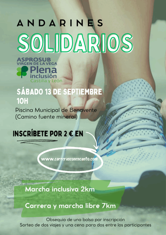 Benavente se prepara para recibir el sábado 13 de septiembre a los participantes de la primera edición de la marcha solidaria “Andarines Solidarios”, organizada por Asprosub. La cita dará comienzo a las 10:00 horas, con salida y meta en las instalaciones de la piscina municipal de la localidad.