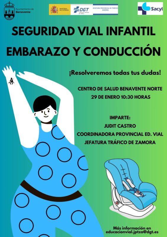 Benavente celebra una jornada sobre Seguridad Vial Infantil, Embarazo y Conducción. El evento se celebrará el próximo miércoles 29 de enero, a las 10:30 horas, en el Salón de actos del Centro de Salud Benavente Norte, con entrada libre.