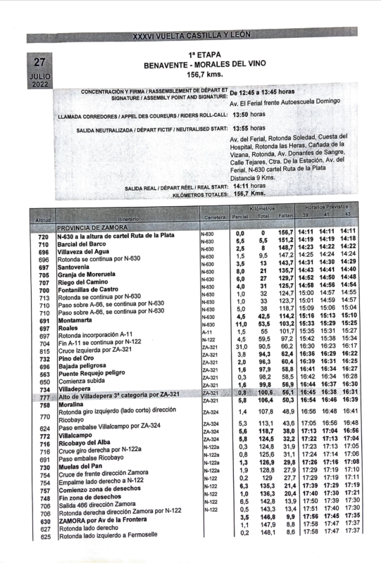 «Desde la Organización de la Vuelta a Castilla y León anunciamos un cambio de recorrido de la primera etapa que tendrá como salida Benavente y llegada Morales del Vino, tal y como estaba previsto en un principio. Finalmente se recorta la distancia a 156,7 kilómetros evitando de esta forma transitar por localidades en riesgo de incendios en la provincia de Zamora.