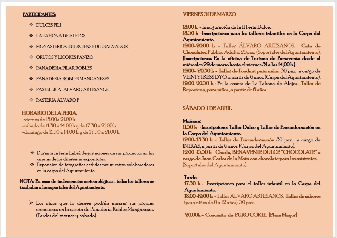 Como novedad, esta feria incluirá una charla impartida por Juan Carlos de la Mata bajo el título “Chocolate” que explicará la historia del chocolate en la ciudad de Benavente. Una charla que tendrá lugar el sábado, 1 de abril a partir de las 12:00 horas y que incluirá una
