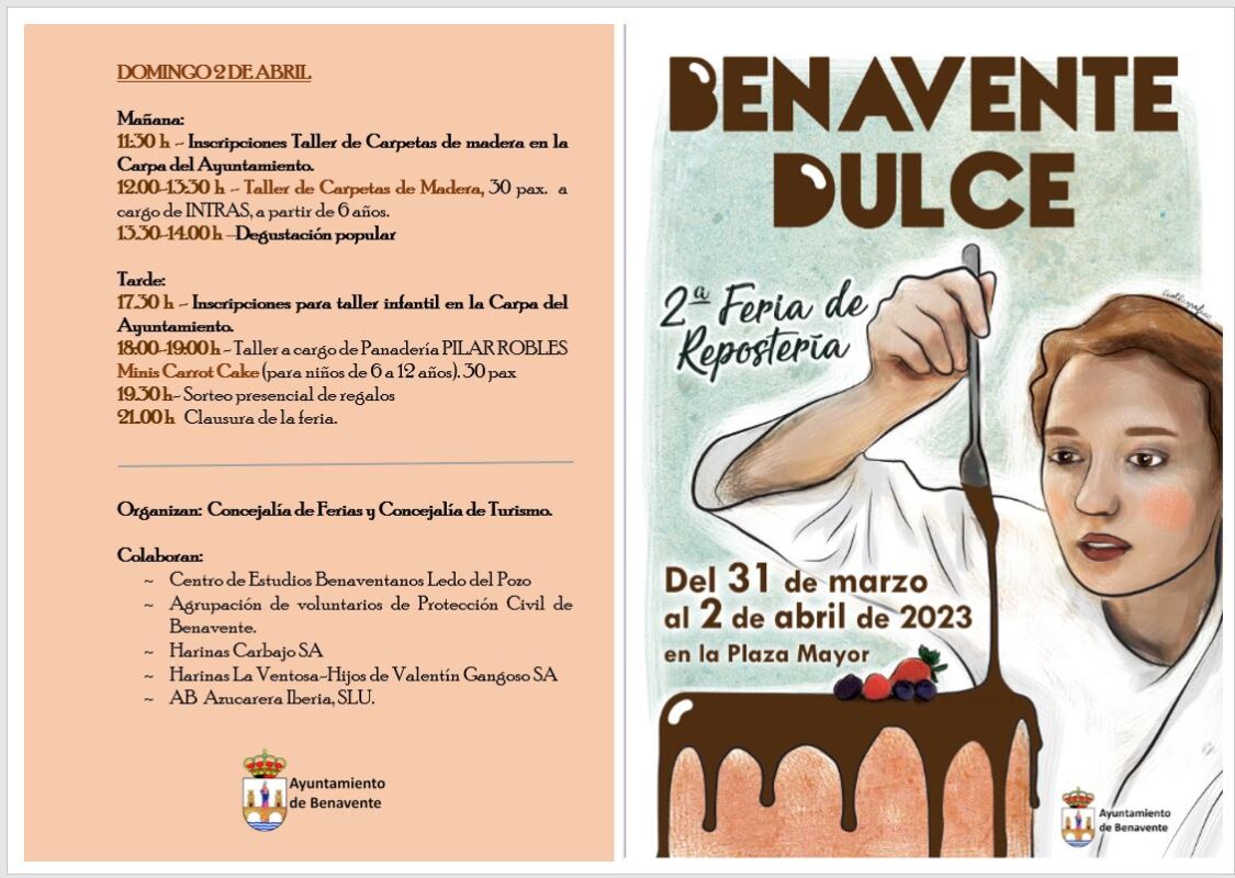 La plaza Mayor de Benavente acogerá el último día de marzo y los días 1 y 2 de abril la segunda edición de la Feria de Repostería con 8 participantes. Durante la Feria habrá degustaciones de sus productos en las casetas, talleres y una exposición de fotografías cedidas por los colaboradores en la carpa del Ayuntamiento. La concejala de Ferias, Sandra Otero, destacó la sencillez de este certamen indicando que las fechas han sido fijadas por los propios participantes.