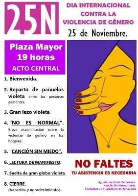 Desde el Ayuntamiento de Benavente se organizan varios actos con motivo de conmemorarse el Día Internacional de la Eliminación de la Violencia contra la Mujer, el día 25 de noviembre. El Área de Bienestar Social, Educación e Igualdad se encarga del programa centrado en el entorno de la Plaza Mayor cuyo abanico se abre a partir de las siete de la tarde con el reparto de pañuelos de color violeta entre las personas asistentes. Se colocará un gran lazo de color violeta antes de una breve escenificación sobre la violencia de género en los hogares “No es normal”.