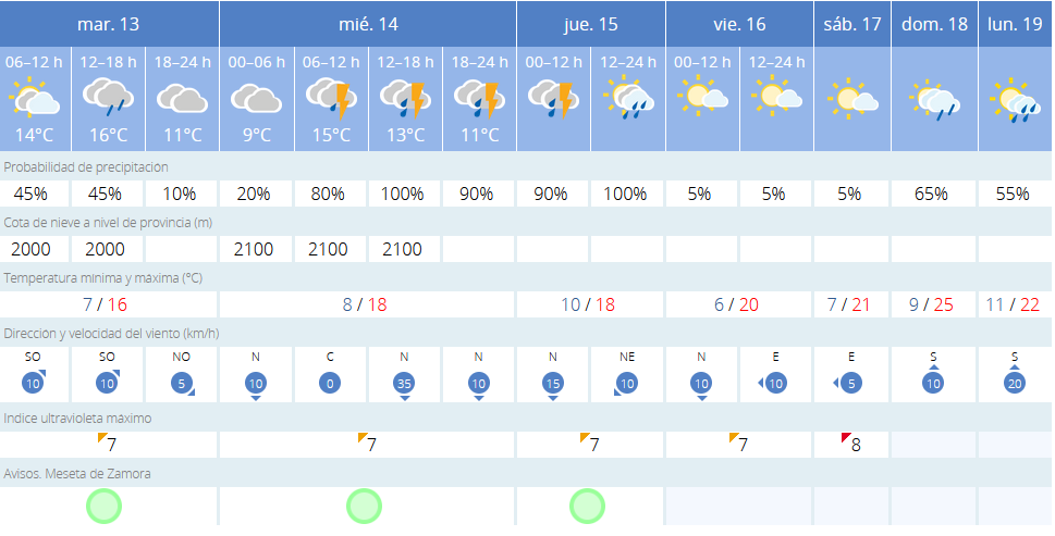 • Jueves 15: Día de tormentas. Desde la mañana hasta la noche, se espera actividad eléctrica y lluvia, con hasta un 100% de probabilidad de precipitación y máximas de 18°C.