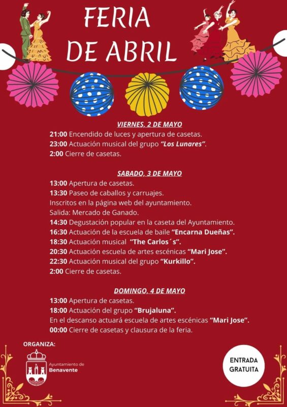 Durante toda la jornada, la Feria de Abril en Benavente continúa ofreciendo actividades para no dejar de bailar: con la actuación de la escuela Encarna Dueñas, conciertos como el de The Carlos’s y Kurkillo, y las actuaciones de la escuela de artes escénicas Mari Jose, completan un sábado lleno de propuestas.