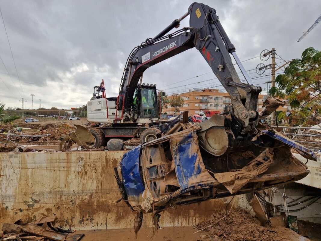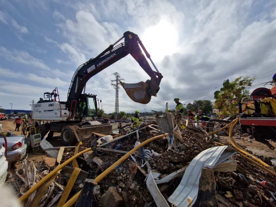 Por su parte, la retroexcavadora trabajó junto a la Unidad 131 de Bomberos de Valencia retirando enseres y desechos de las calles. Este equipo operó prácticamente sin descanso, pausando solo para comer brevemente, debido a la gran cantidad de escombros y el nivel de destrucción en la zona.