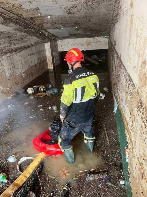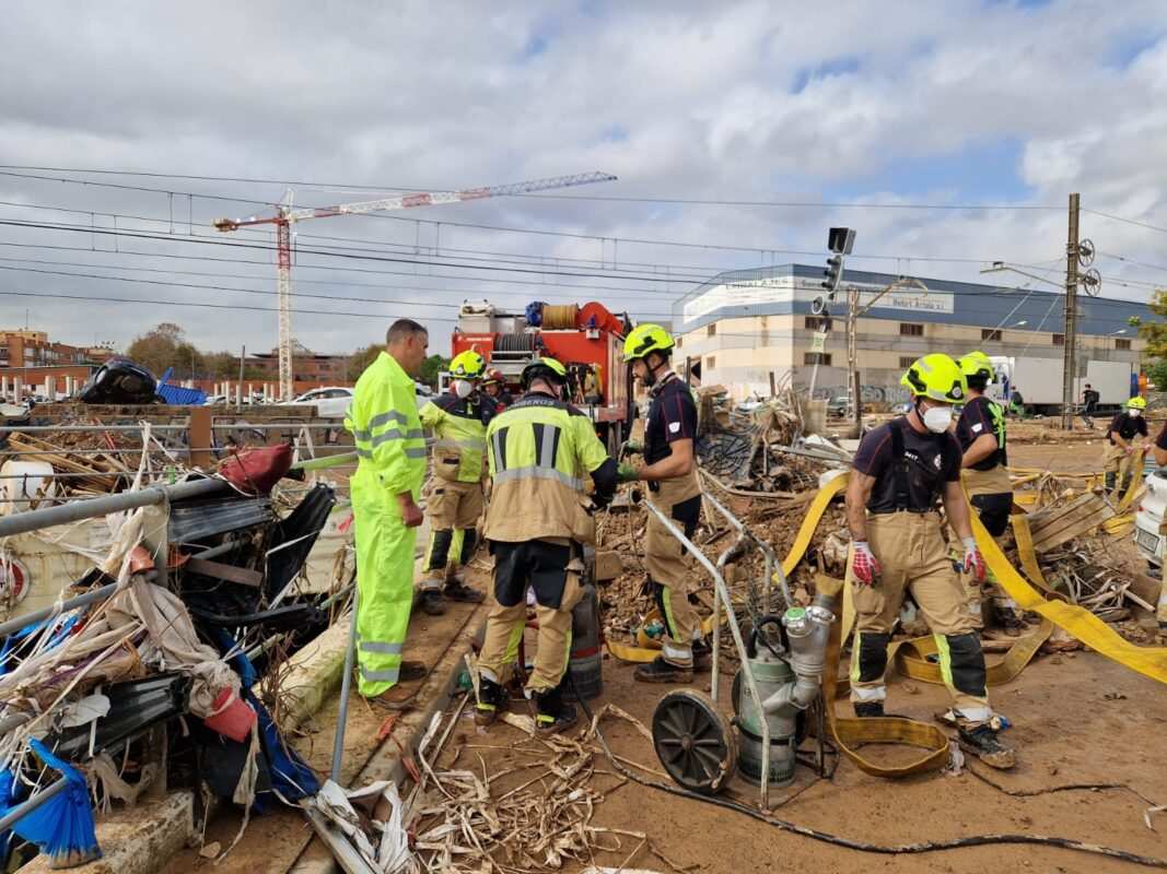 Después de las labores en Buñol, el equipo de bomberos se desplazó a Alfafar para iniciar las tareas de limpieza y achique de agua en calles y accesos a zonas subterráneas. En una de las calles principales, trabajaron en el desescombro hasta llegar a la entrada de un parking subterráneo, donde varios coches quedaron cubiertos por el agua. Para evacuar el agua acumulada, emplearon una bomba del camión y tres motobombas, con las que trabajaron de manera ininterrumpida hasta las 20:00 horas, al finalizar la jornada.
