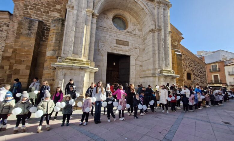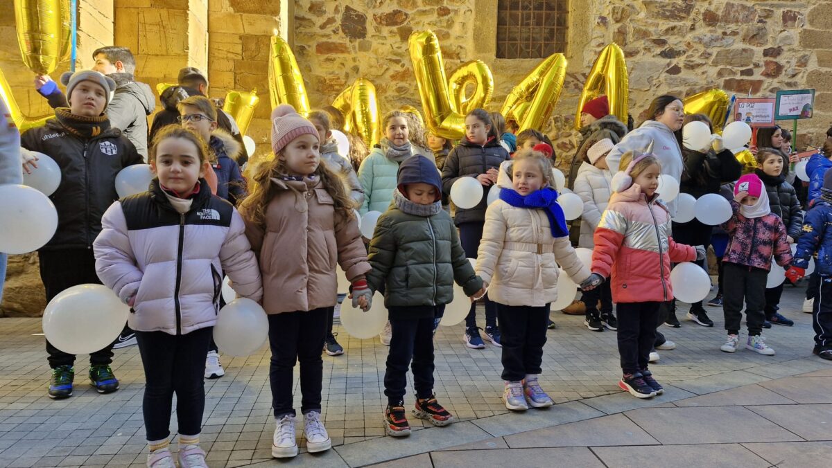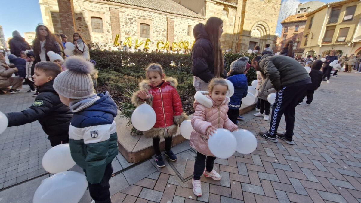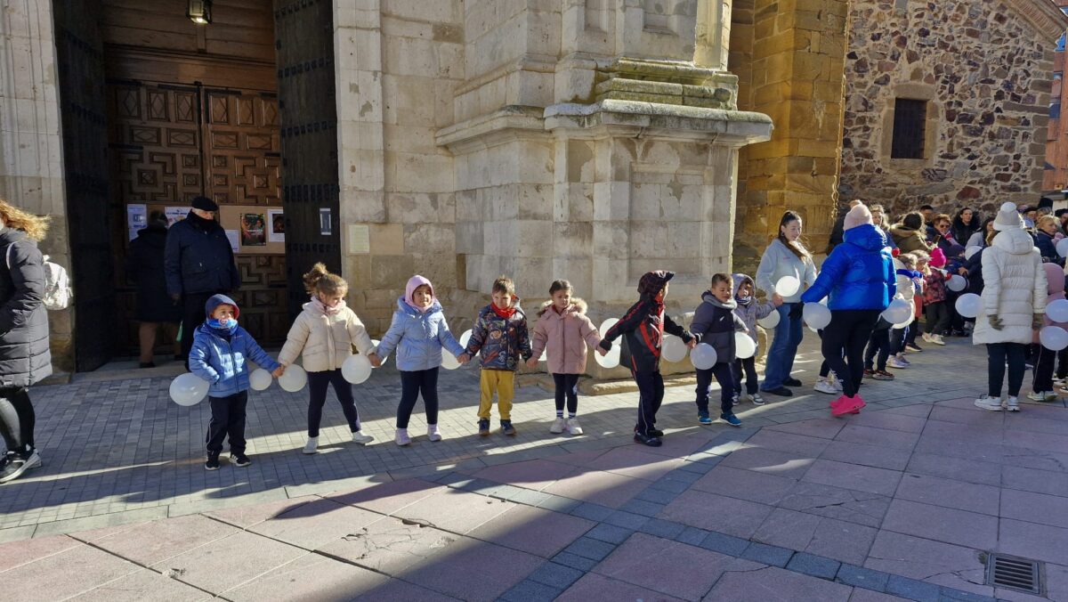 A las 12:00 del mediodía, comenzó la jornada con una gran cadena humana que rodeó la iglesia de Santa María. Los niños, acompañados de globos blancos, formaron un círculo alrededor del templo, un símbolo de pureza y de paz que se elevaba al ritmo de sus pasos. Los padres se unieron al gesto, creando un ambiente de solidaridad y participación que se extendió por todo el centro de Benavente.