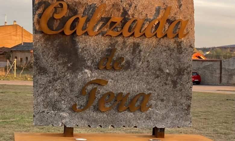 A la vera de la milenaria calzada romana, la vía Augusta XVII, de Asturica a Bracara, la denominada por la Comisión Europea como el sendero de gran recorrido GR-117, en el acceso a la localidad así bautizada, Calzada de Tera, un monolito saluda a los visitantes y peregrinos.