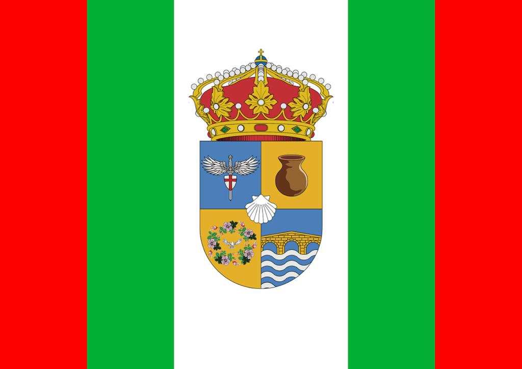 Paño rectangular cuya longitud es una vez y media su altura. Dividido verticalmente en cinco franjas. La del centro, de color blanco y con una anchura equivalente a ⅓ de la longitud total del paño, y cargada en el centro con el escudo anteriormente descrito, con una altura equivalente a 2/3 de la altura del paño. A cada lado de la franja central, una franja de color verde, y en los extremos del paño otras dos, de color rojo; la anchura de cada una de estas cuatro franjas será de ⅙ de la longitud total del paño.