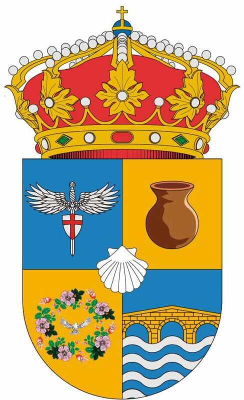 Cuartelado. Primero, de azur, espada de plata, con la punta hacia abajo, de cuya empuñadura surgen dos alas de lo mismo, y cuya hoja va cargada con un escudo de plata con una cruz de gules. Segundo, de oro, vasija de barro en su color. Tercero. de oro, paloma de plata en vuelo, rodeada por un círculo de flores de agavanza al natural. Cuarto, de azur, puente de tres ojos de oro, aclarado de azur, sobre ondas de plata y azur. Brochante sobre el todo, venera de plata. Al timbre, corona real cerrada.