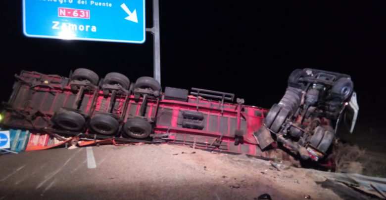 Un camión de gran tonelaje volcaba esta noche en la A-52 con dos personas en su interior que han salido ilesas de este accidente. Los bomberos de Rionegro del Puente y Benavente han acudido en la noche del pasado domingo al lunes a la A-52 tras el vuelco de un camión de gran tonelaje a la altura de la salida de Rionegro del Puente.