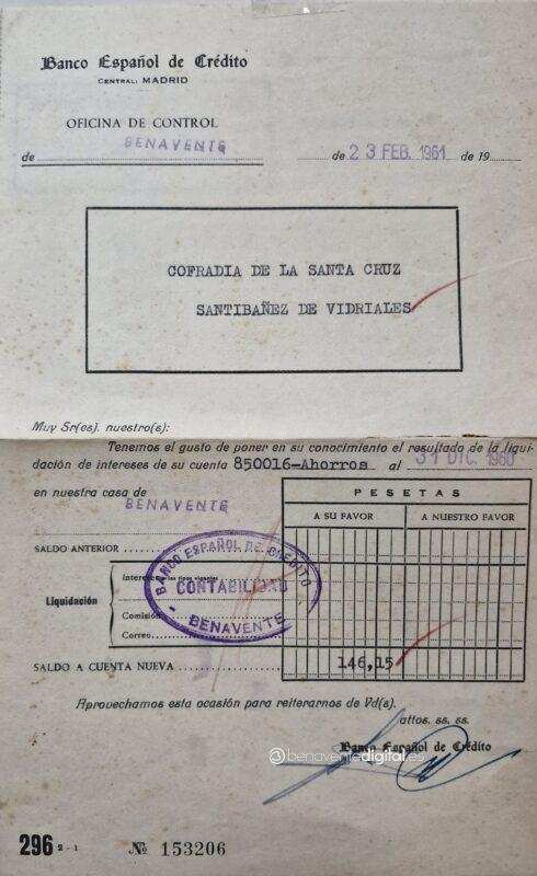 Por eso, en el año 1951 el saldo total se cuantifica en 638 pesetas. Por primera vez se superan las 1.000 pesetas, concretamente 1.064 pesetas, siendo ya el año 1955 y tras abonar los gastos de enterrador (120 pesetas), otras 40 pesetas al cura y otras 30 pesetas por la compra de un caldero en una de las ya cuatro ferreterías existentes en la pujante villa de Santibáñez de Vidriales. Llama la atención que en ese año de 1955 se pague por utilizar las andas 12 pesetas y a un vecino se le cobre 50 pesetas. Una cantidad esta última que quedará establecida a partir de la reunión del cabildo del 3 de mayo de 1956: «Se acordó con todos los cofrades que toda persona que falleciera y no fuese hermano de la Santa Cofradía, tendrá que abonar cincuenta pesetas por el servicio de las andas; pagar los derechos al enterrador y no siendo obligación a los hermanos de hacerle llevar el cadáver».