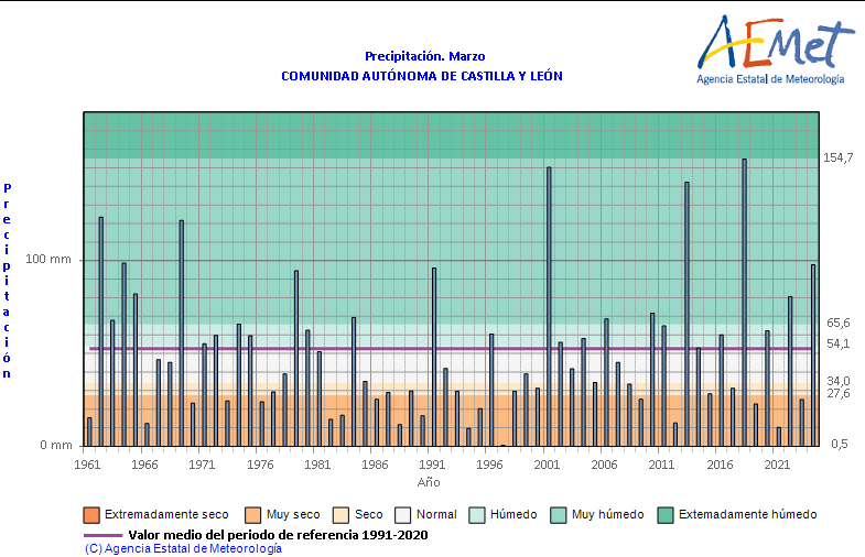 En cuanto a las lluvias, marzo de 2024 se ha caracterizado en Castilla y León por ser un mes “muy húmedo”, excepto en el Norte de León y el Noroeste de la Comunidad, donde ha sido “húmedo”, y en el Noroeste de Burgos, donde se han registrado valores normales.