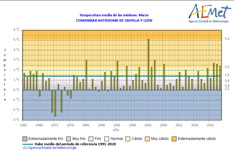 La temperatura mínima del mes se registró en la estación de esquí La Covatilla (Salamanca), 8 grados bajo cero el 3 de marzo, siendo la jornada más fría en el conjunto de la Comunidad, con una media que se situó en los 2,7º. A lo largo de todo el mes se registraron siete días de heladas frente a los 12 de media que se contemplan.