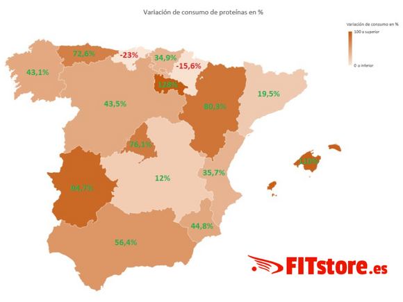 El auge del comercio de proteínas en polvo se generaliza en casi todos los puntos de España; siendo la comunidad de Aragón una de las que más ha crecido, alcanzando en 2022 cerca de un 80,3% más que en 2020; junto a Islas Baleares, con un 110% más; o La Rioja (un 128% más). También destacan Madrid, cuyos habitantes consumen un 76,1% más; Extremadura (94,7%); o Andalucía y Galicia, donde las cifras alcanzaron un crecimiento de un 56,4% y un 43,1%, respectivamente.