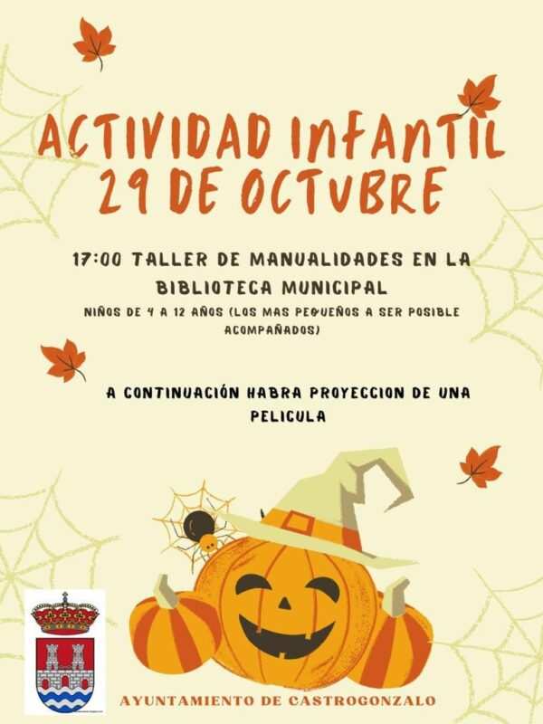 Castrogonzalo ha organizado una serie de actividades relacionadas con Halloween con motivo de la Festividad de Todos los Santos. Los actos comenzarán el 29 de octubre con un taller de manualidades que dará comienzo a las 17 horas en la Biblioteca Municipal y que está destinado para niños y niñas de 4 a 12 años, preferiblemente acompañados por un adulto. Al finalizar la actividad se proyectará una película.