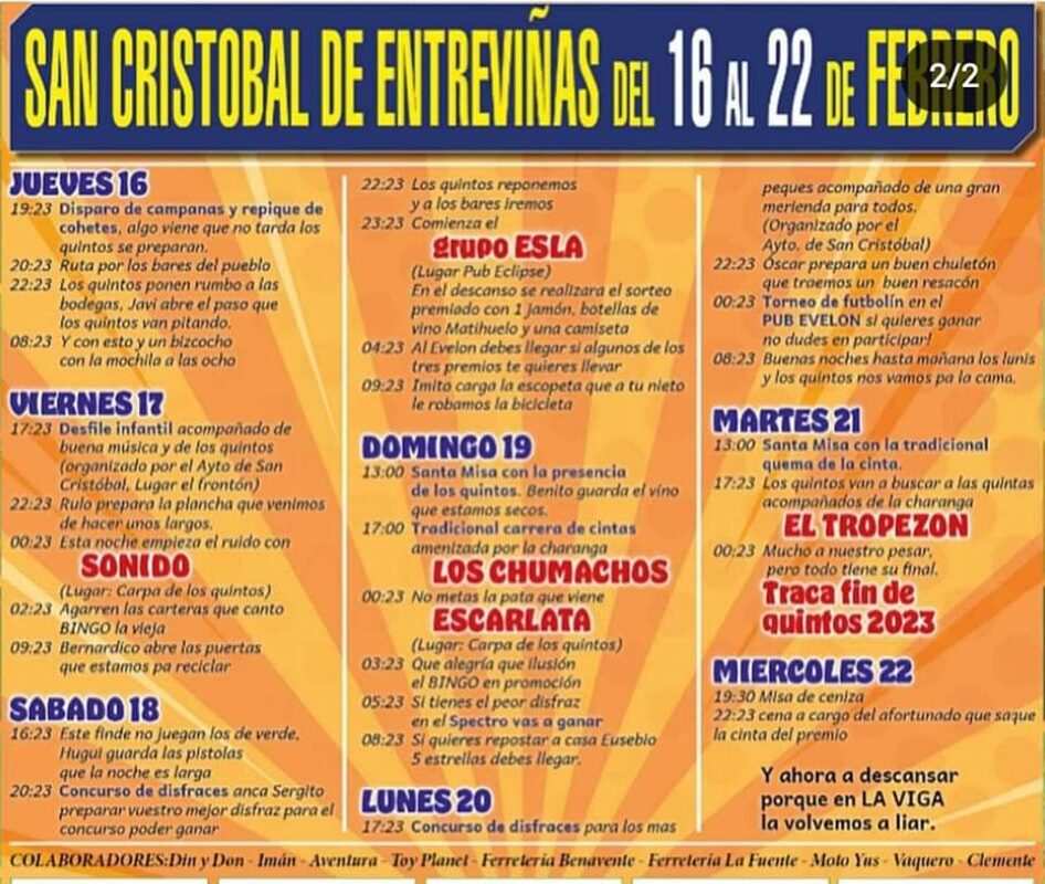 El abanico programático de actividades se extendía al atrdecer de este jueves con el alborozo general de la comitiva en un recorrido por los bares del pueblo. Para la tarde de este viernes está previsto el desfile infantil organizado por el Ayuntamiento en el frontón, dando paso en la noche a la velada festiva en la carpa de los quintos con el grupo musical Sonido. Los disfraces y bailes se suceden el sábado con el grupo Esla y será el domingo por la tarde cuando la mocedad corra las cintas a lomos de los caballos. La charanga los Chumachos se encarga de animar el festejo, dando pasoe n la noche al grupo Escarlata.