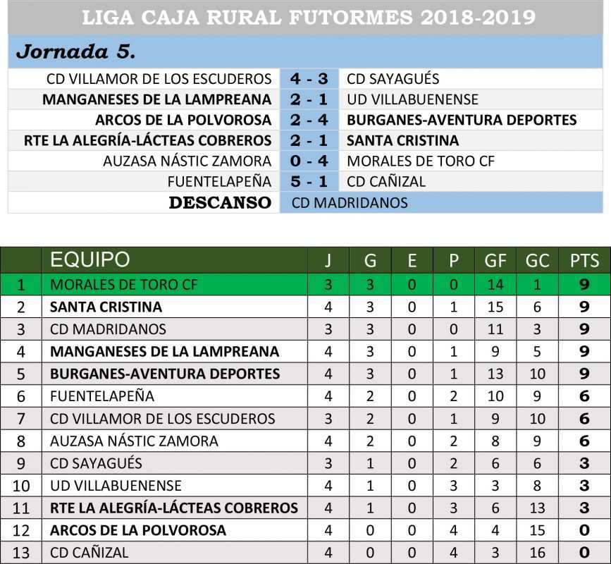 Sorpresa con mayúsculas en la Liga Caja Rural Futormes en la disputa de la quinta jornada con la victoria del Restaurante la Alegría-Lácteas Cobreros que ganaba su primer partido y lo hizo de forma grande ante el líder. Santa Cristina no pudo seguir la racha de triunfos que le mantenía en esa posición y fue incapaz de deshacerse de un Fuentes de Ropel que ansiaba la victoria. El tapado, Morales de Toro, ya se ha aupado a la cabeza de la clasificación con un imponente triunfo en la cancha del Nastic Zamora y ojo que además solamente ha encajado un tanto y tiene un partido menos disputado con lo que le coloca el cartel de favorito de la liga. Otro duelo comarcal fue el disputado en Arcos de la Polvorosa entre el equipo titular y el Atlético Burganes-Aventura Deportes que se llevaba el triunfo. Por su parte Manganeses de la Lampreana tuvo más problemas de los previstos para ganar, en su campo, al Villabuenense.