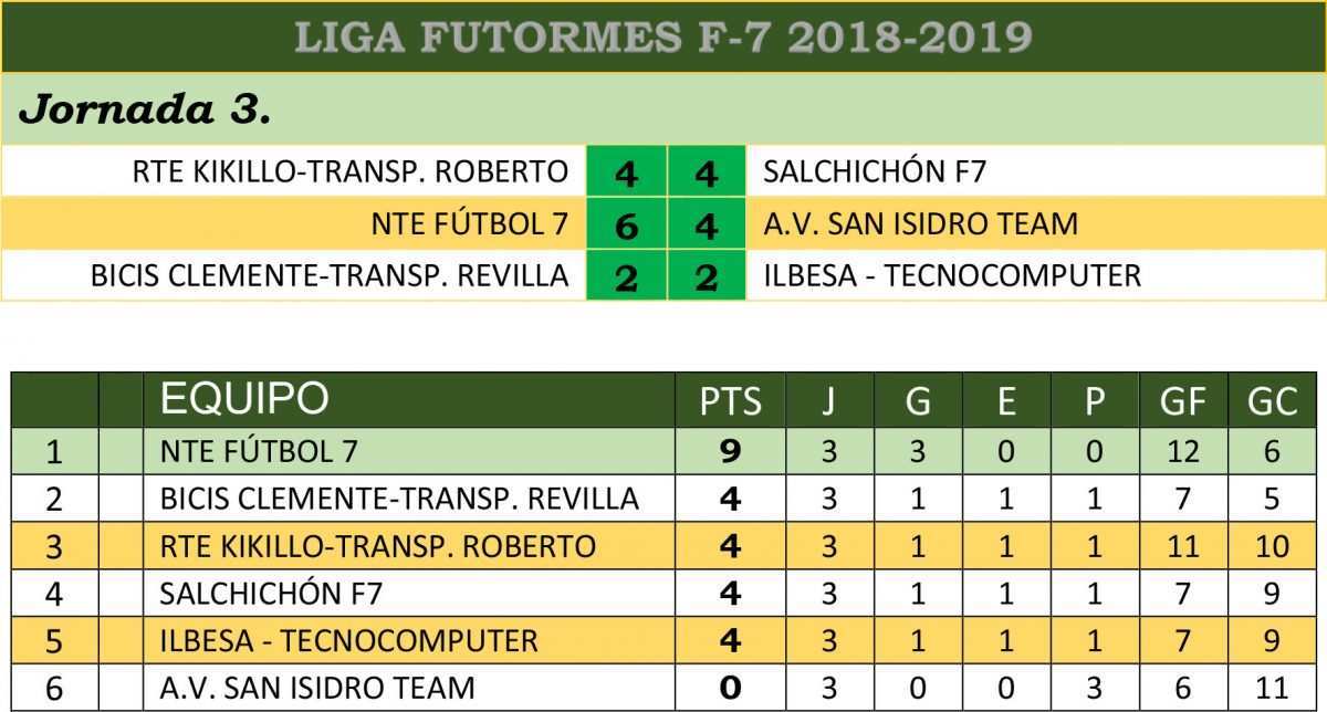 Ya en la tercer jornada de la Futormes F-7 NTE fútbol 7 consiguió tres nuevos puntos para afianzarse en el liderato y además aprovechando que los otros dos partidos finalizaron en empate por lo que ya son cinco la diferencia de puntos que marca en la tabla.