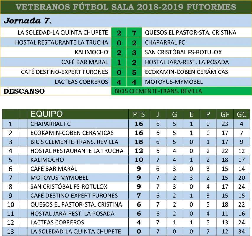 Séptima jornada en la Futormes Liga de Veteranos y con un nuevo partido importante en la parte alta de la clasificación con el emparejamiento entre Restaurante La Trucha y Chaparral que el vigente campeón se llevaba al agua. Una victoria que le permite retomar el mando de la tabla que la semana pasada había cedido al Bicis Clemente-Transportes Revilla que no había descansado y que por lo tanto iba con un partido más. El otro de los equipos que acompaña en la cabeza de la clasificación al Chaparral es el Chimeneas Ecokamín-Coben Cerámicas que también ganaba en la jornada de ayer viernes al siempre complicado Cervecería Café Destino. Una de las sopresas vino de la mano del choque entre Kalimocho y San Cristóbal Rotolux con la victoria de este segundo que había arrancado muy bien la temporada pero que había ido a menos en las últimas jornadas. Quien parece haber arrancado ya definitivamente es el Hostar Jara-Restaurante La Posada que volvió a sumar tres puntos a costa del Café Bar Maral.
