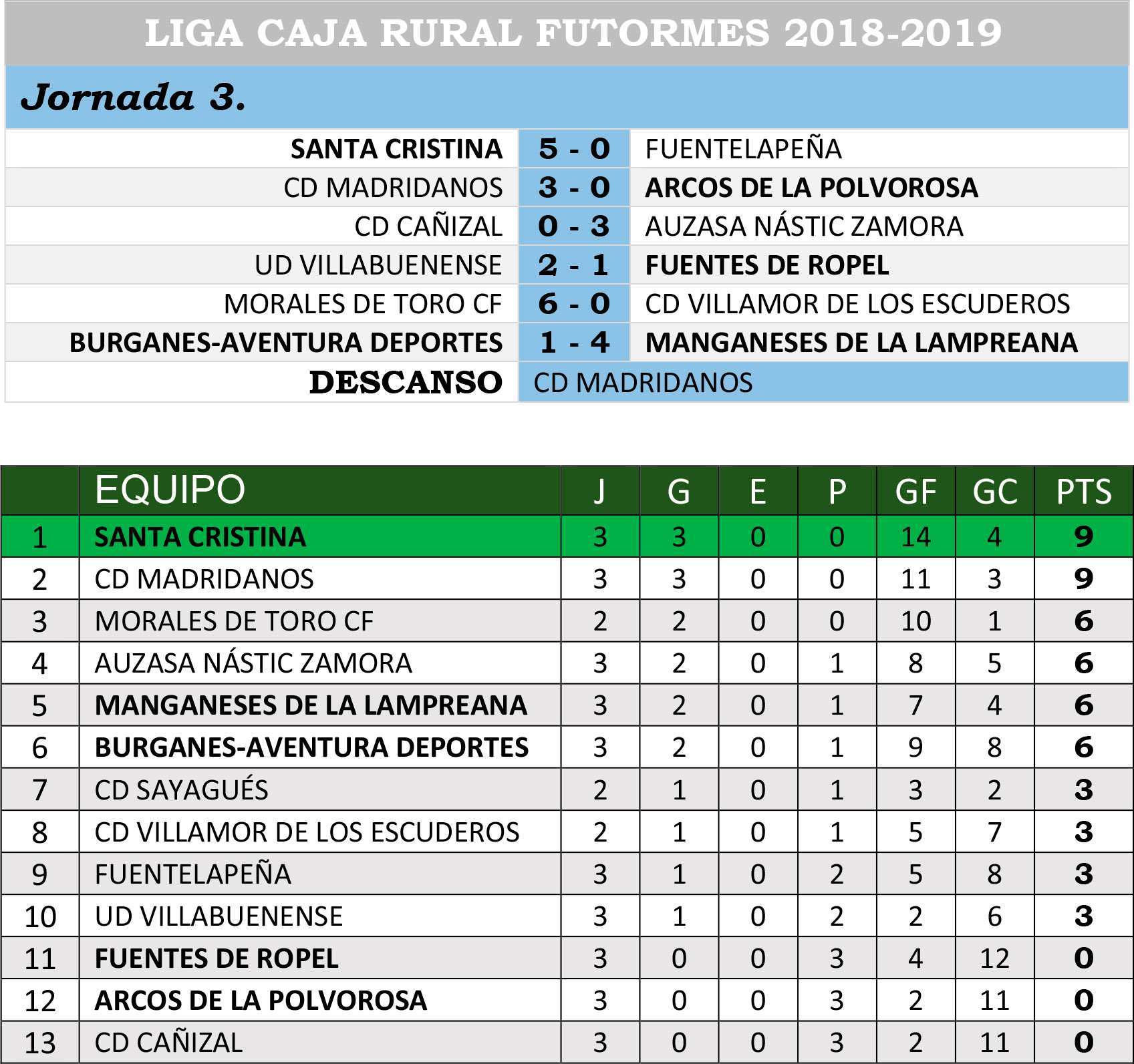 En la Liga Futormes Caja Rural, Santa Cristina sigue mandando en la tabla en tras ganar con autoridad en esta tercera jornada al Fuentelapeña, pero ojo que el tapado puede ser el Morales del Vino, un equipo que dió guerra en la provincial el año pasado y que le endosaba un 6-0 al Villamor de los Escuderos, equipo este que también ha estado en competiciones superiores. Hubo, por otro lado, sorpresas con la derrota del Burganes-Deportes Aventura en su casa ante el Manganeses de la Lampreana.
