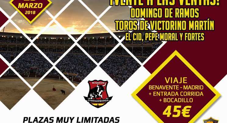 Con motivo del 5º Aniversario de la Asociación Taurina Charamandanga, organizan un viaje a la Plaza de Toros de Las Ventas de Madrid para presenciar la corrida del Domingo de Ramos del próximo 25 de marzo. La corrida será con los toros de la ganadería Victorino Martín para los diestros El Cid, Pepe Moral y Fortes.