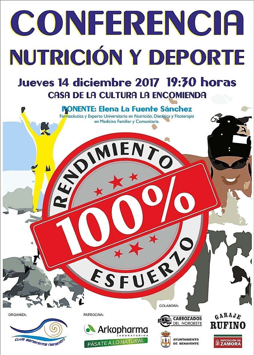 Además veremos como una buena alimentación puede contribuir directamente en el aumento del rendimiento. Las charlas sera protagonizadas por Elena De La Fuente, experta en Nutrición, Dietética y Fisioterapia. Estas conferencias van dirigidas a todos los deportistas de Benavente que estén interesados en ampliar sus conocimientos sobre el tema.