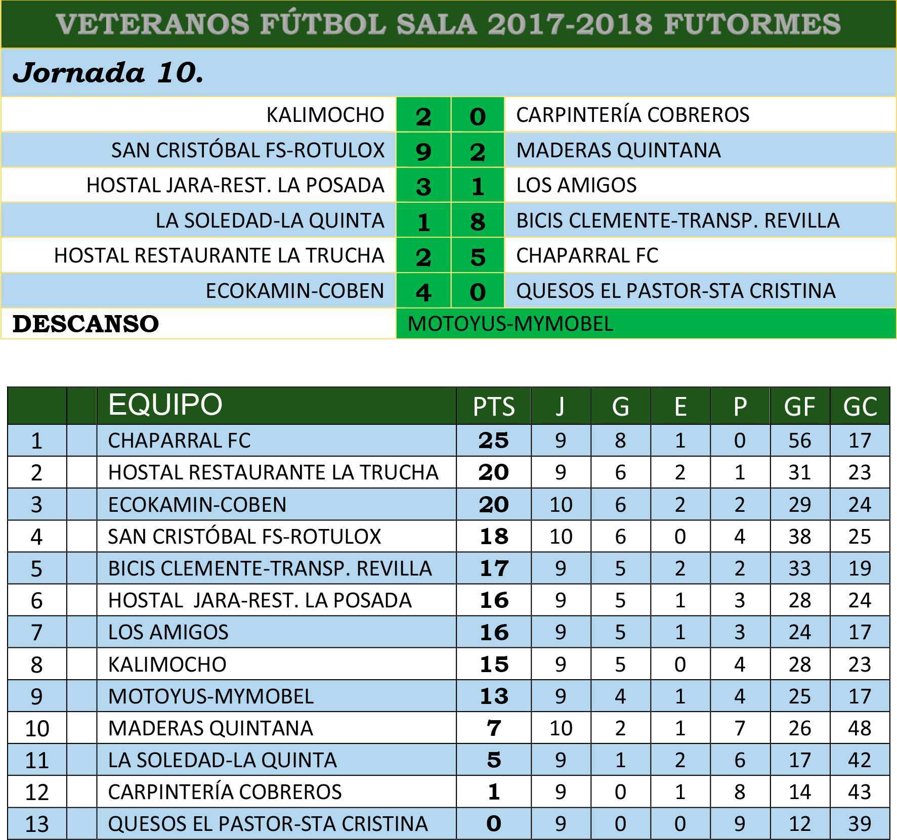 En la Liga de Veteranos el Chaparral sí que ha conseguido abrir hueco tras la victoria de la pasada semana ante el segundo clasificado por 2 a 5 que les deja a cinco puntos de segundo Restaurante la Trucha y tercero Chimeneas Ecokamín-Coben Cerámicas, aunque este último con un partido más que corresponde a la jornada de descanso que deberá de realizar.