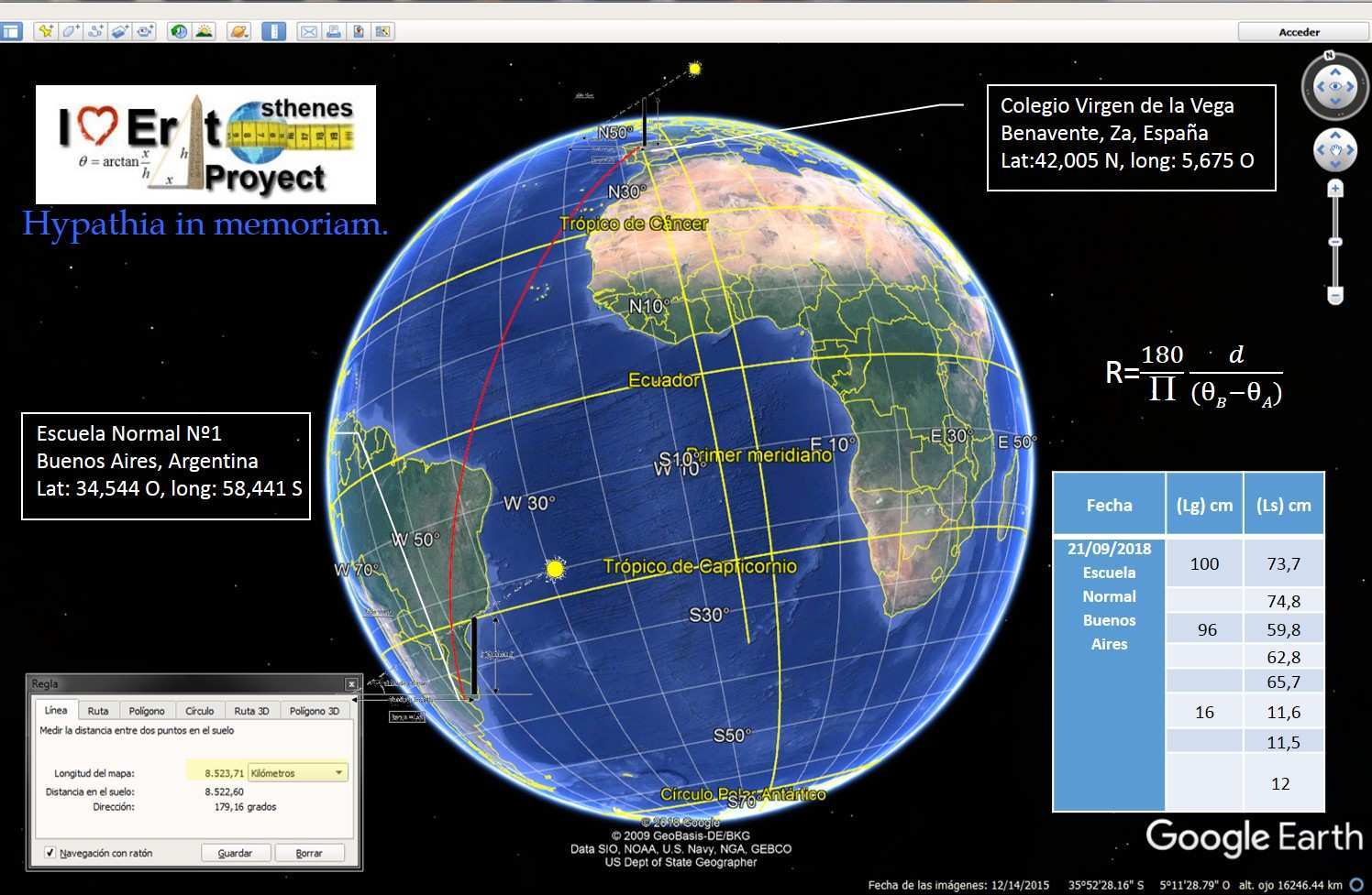 En fechas próximas al equinoccio de otoño, 23 septiembre, cuando los rayos del sol llegan paralelamente al ecuador de la Tierra, alumnos de más de 200 colegios de todo el mundo participan colaborativamente, para medir el radio de la Tierra utilizando el método de Eratóstenes, filósofo griego, matemático y astrónomo, siglo III a. C.