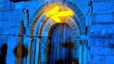 Una flecha amarilla proyectada sobre la fachada norte y sur del templo románico de Santa Marta de Tera señala el camino mozárabe sanabrés. La proyección artística luminosa, desde esta noche…
