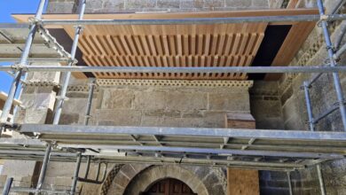 La escultura pétrea del Santiago Peregrino más antigua que se conoce ya se encuentra bajo cubierta. Un tejaroz o tejadillo corona la portada sur de la iglesia románica de Santa…